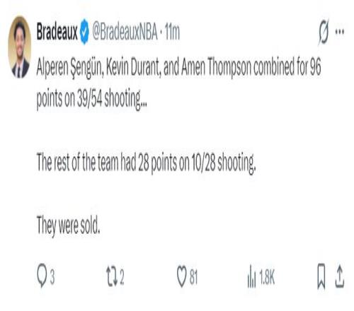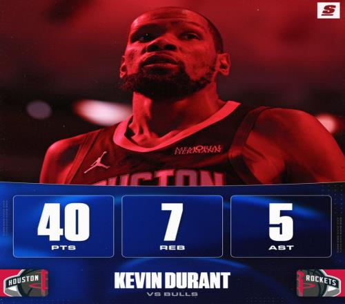 休媒谈到这场比赛的失利:杜兰特40分火箭生涯最高分,申京19中16拿到33+13+10,我真的不敢相信输给公牛这种球队 ,他们过去25场只赢了5场吧。