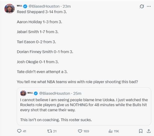 休媒:我不敢相信这场失利还有人喷乌度卡,我只看到火箭角色球员在48分钟里毫无作为,而公牛可以命中他们接到的球。这与教练无关,这轮换太糟糕了,泰特甚至都不敢出手三分,你告诉我哪支球队的角色球员这样的比赛能获胜? |