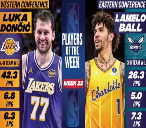 第一则:周最佳球员诞生,鲍尔东契奇当选 NBA官方公布了第22周的东西部周最佳球员,东部由黄蜂后卫鲍尔当选,西部由湖人后卫东契奇当选。鲍尔上周场均贡献26.3分+6.8篮板+6.3助攻+2.3抢断,带领黄蜂队取得3胜0负的战绩。据统计,这是鲍尔生涯首次拿到该奖项。东契奇上周场均爆砍42.3分+6.8篮板+6.3助攻+3抢断,带领湖人队取得4胜0负的战绩。据统计,这是东契奇连续两周获此殊荣,也是东契奇本赛季第4次拿到该奖项,生涯第19次拿到该奖项。沃克、布朗、杜伦、哈登、莫布里、唐斯、阿夫迪亚、克林根、道苏姆、戈贝尔、亚历山大、阿门、文班亚马等人获得了周最佳提名。