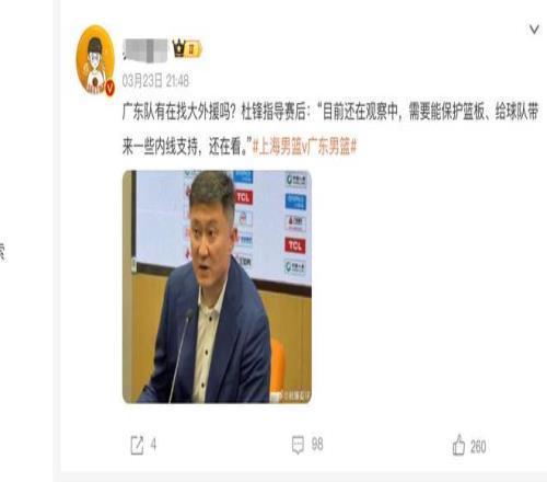 在赛后的采访当中,杜锋在总结整个球队出现了一些问题之后,也重点提到了外援这一方面的人选。他爆料目前球队还在物色新的外援,希望能够寻找新的大外援来帮助球队提升内线方面的实力,保护好篮板。所以从杜锋透露的这个消息我们可以了解到,朱芳雨他们其实正在努力的寻找全新合适的大外援,帮助广东男篮解决内线的这一块短板。
